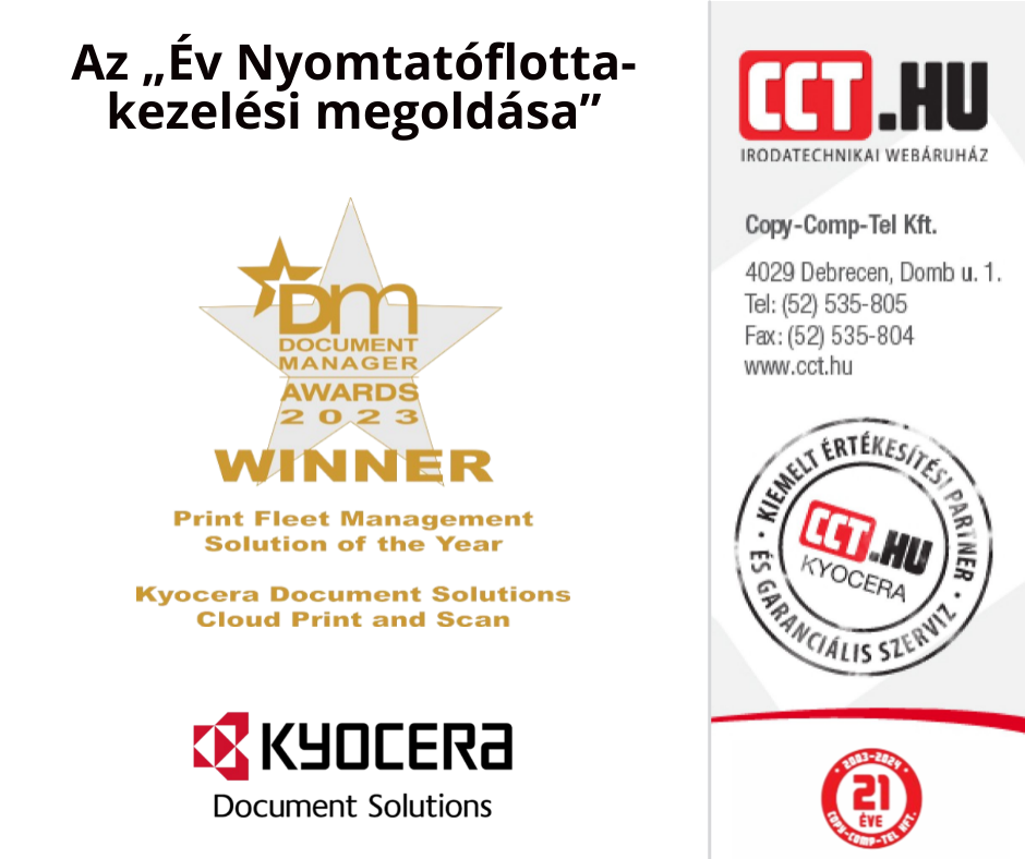 Az „Év Nyomtatóflotta-kezelési Megoldása”2024-03-04 13:09:53. 0. "Kyocera Cloud Print and Scan” felhő alapú alkalmazása nyerte az „Év Nyomtatóflotta-kezelési Megoldása” díjat az Egyesült Királyságban." A Kyocera Document Solutions UK (ügyvezető igazgató: Rod Barthet) örömmel jelenti be, hogy felhő alapú nyomtatási és szkennelési alkalmazása, a Kyocera Cloud Print and Scan elnyerte az „Év nyomtatási flottakezelési megoldása” díjat a DM AWARDS 2023 rendezvényen. London, Egyesült Királyság. ![]() A DM AWARDS 2023 egy éves rendezvény, amelynek házigazdája a Document Manager Magazine, az Egyesült Királyság vezető dokumentumkezelési szakkiadványa, amely 18 éve létezik, és amelyre üzleti szakemberek és iparági vezetők fizetnek elő. A DM AWARDS 2023 egy évente megrendezésre kerülő esemény a kiemelkedő dokumentumkezelési megoldások és szolgáltatások elismerésére, valamint az iparág vezetőinek és újítóinak elismerésére. Ez az első alkalom, hogy megkaptuk ezt a díjat, és úgy gondoljuk, hogy ez hitelesebbé és professzionálisabbá teszi a vállalkozásoknak és magánszemélyeknek kínált megoldásainkat, és a jövőben több figyelmet vonz majd magára. A Kyocera Cloud Print and Scan egy olyan felhőalkalmazás, amely biztonságos környezetet biztosít, amely megakadályozza az információszivárgást a nyomtatott anyagokból a különböző munkafolyamatú irodákban. Olyan rendszert is biztosít, amely hatékony és problémamentes nyomtatást és szkennelést tesz lehetővé, még akkor is, ha a hely vagy az eszköz megváltozik. A díjat a különböző szempontok általános elismeréseként ítélték oda, beleértve a hitelesítési módszereket, az egyszerű kezelést, a támogatott eszközök sokféleségét, az alacsony telepítési költségeket és a támogatott felhőszolgáltatásokat. A Kyocera Document Solutions Group továbbra is megoldás-alkalmazásokat és szolgáltatásokat fog nyújtani a „Digitalizálás”, „Kezelés/Tárolás”, „Működtetés/Megosztás” és „Nyomtatás” dokumentumciklushoz kapcsolódó területein annak érdekében, hogy kielégítse az ügyfelek dokumentumkezelési igényeit. Forrás: https://www.kyoceradocumentsolutions.com/en/news/rls_2024/rls_20240207.html KCPS cikk: A Kyocera Cloud Print and Scan alkamazásról itt olvashatja el részletes cikkünket... ![]() Keressen minket elérhetőségeinken... CCT.HU
