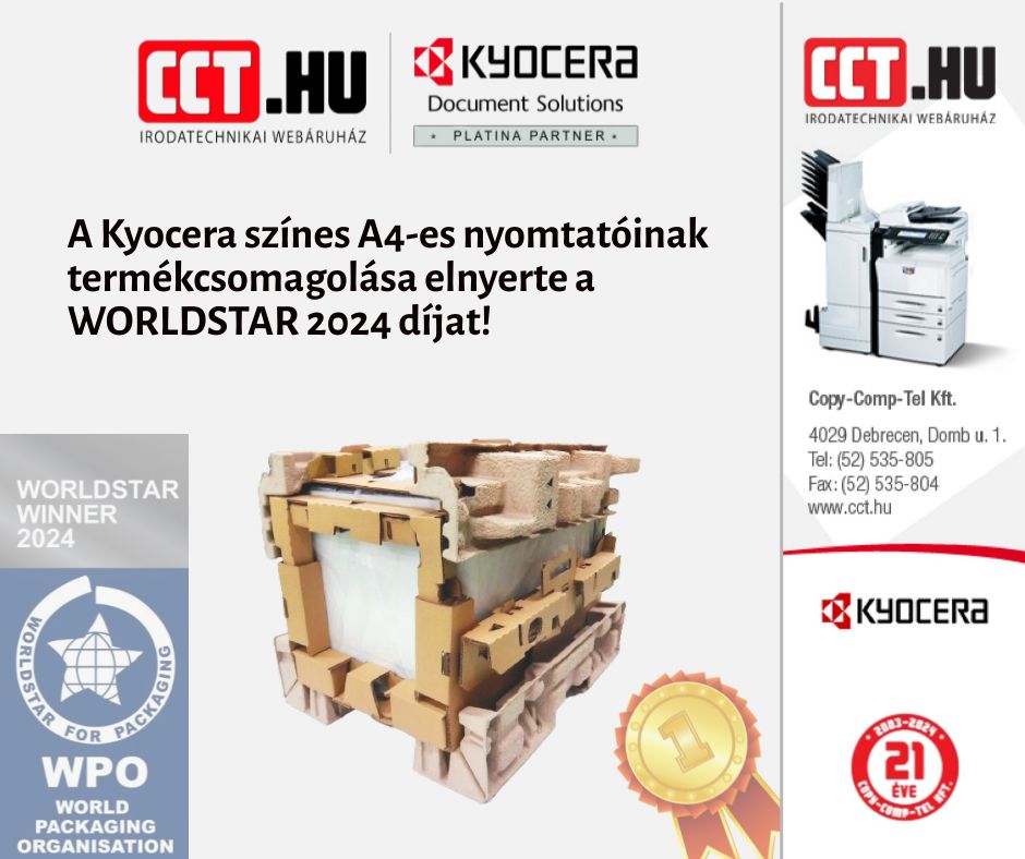 A Kyocera elnyerte a WORLDSTAR 2024 díjat!2024-03-04 13:11:30. 0. A Kyocera elnyerte a WORLDSTAR 2024 díjat! Örömmel jelentjük be, hogy a Kyocera Document Solutions Inc. színes A4-es nyomtatóihoz készült termékcsomagolás nyerte a "WORLDSTAR 2024" díjat a WORLDSTAR GLOBAL PACKAGING AWARDS rendezvényén, amelyet a Csomagolási Világszervezet szervezett. Ez a verseny a legnagyobb verseny a globális csomagolási területen. ![]() A WORLDSTAR GLOBAL PACKAGING AWARDS a legnagyobb verseny a globális csomagolási területen, ahol 1970 óta adnak át díjakat. ![]() A Kyocera Document Solutions Inc. több mint 20 éve fejleszt hosszú élettartamú és alacsony hulladékot termelő MFP-ket és nyomtatókat, minimálisra csökkentve az ártalmatlanított fogyóeszközök számát, és környezetbarát termékeket szállítanak. Környezetbarát csomagolásra törekednek úgy, hogy elsősorban cellulózformákat és újrahasznosított papírból készült hullámkartont használnak a „műanyagtól való megszabadulás érdekében”. Annak érdekében, hogy az általuk fejlesztett MFP-k és nyomtatók csomagolásához használt műanyag hab párnázóanyagot papír párnázóanyagra cseréljék, azon dolgoznak, hogy javítsák az ismétlődő ütésállóságot (többszörös ütésekkel szembeni ütésállóságot), amely a papír párnázóanyag gyenge pontja volt. Ellentétben a habosított párnázóanyaggal, a papír párnázóanyagnak nincs rugalmassága, így a párnázási teljesítménye romlik, ha többszöri ütésnek van kitéve. ![]() Ezért javították az ismétlődő párnázási teljesítményt azáltal, hogy a hullámos párnázóanyagban támasztó alakot vettek fel, és olyan formát alkalmaztak, amely megakadályozza a cellulózforma összeomlását és törését. Ennek eredményeként az ütésállóság akár 61%-kal is csökkent egy olyan teszt során, amelyben a terméket ötször egymás után négy oldalról leejtették. Gratulálunk a Kyocera-nak a kiemelkedő eredményért és büszkék vagyunk, hogy a termékeiket értékesíthetjük! Forrás: https://www.kyoceradocumentsolutions.com/en/news/rls_2024/rls_20240131.html https://worldstar.org/winners_detail/3939/2024/
