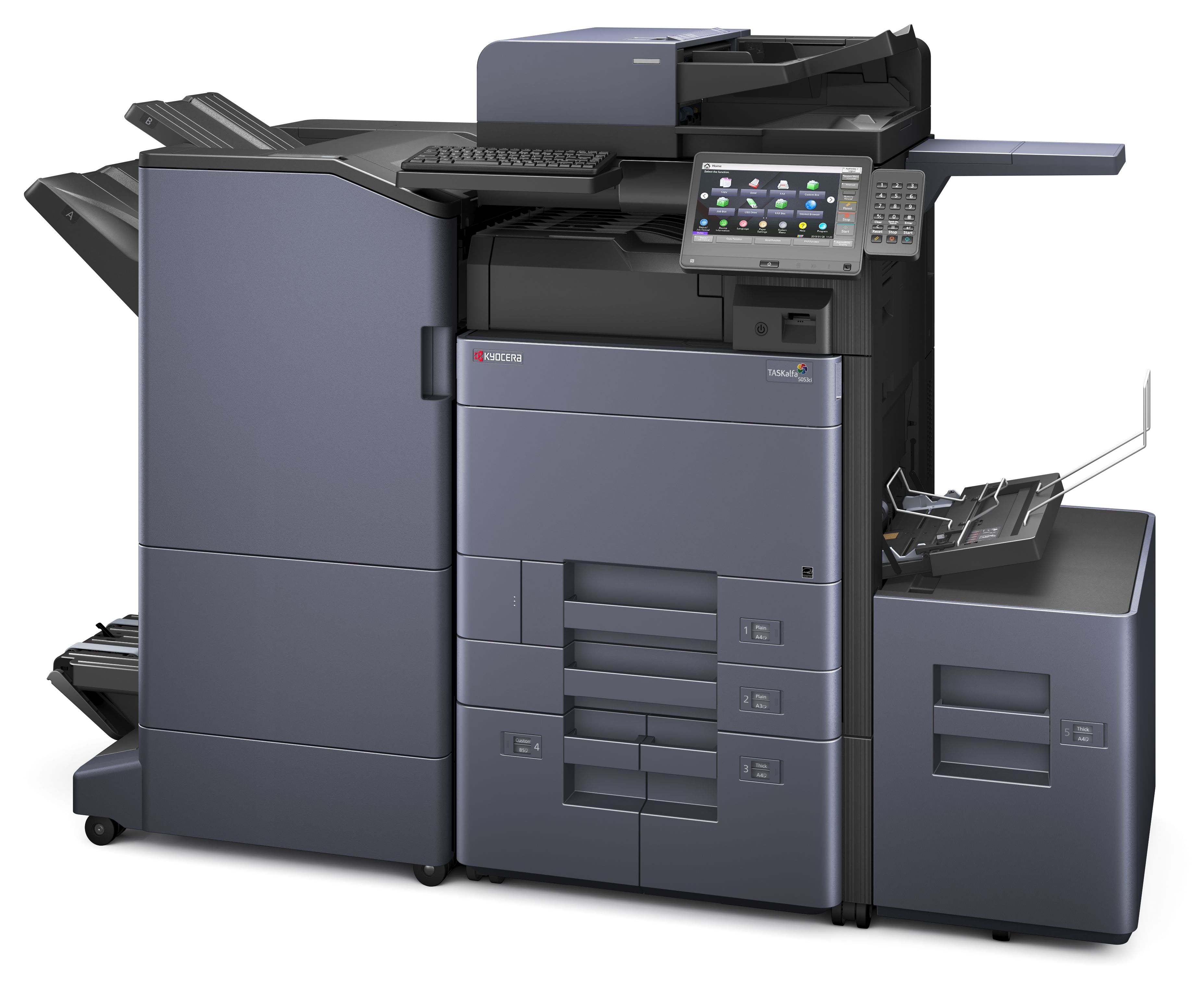- DF-7110* Befejezőegység + AK-7110: Főtálca: Max. 4 000 A4-es lap (300 lap BF-730 kiegészítővel); max. 52 – 300 g/m2; max. A6R–SRA3, Három helyen képes összetűzni akár 65 A4-es vagy 30 A3-as lapot, B5 –SRA3