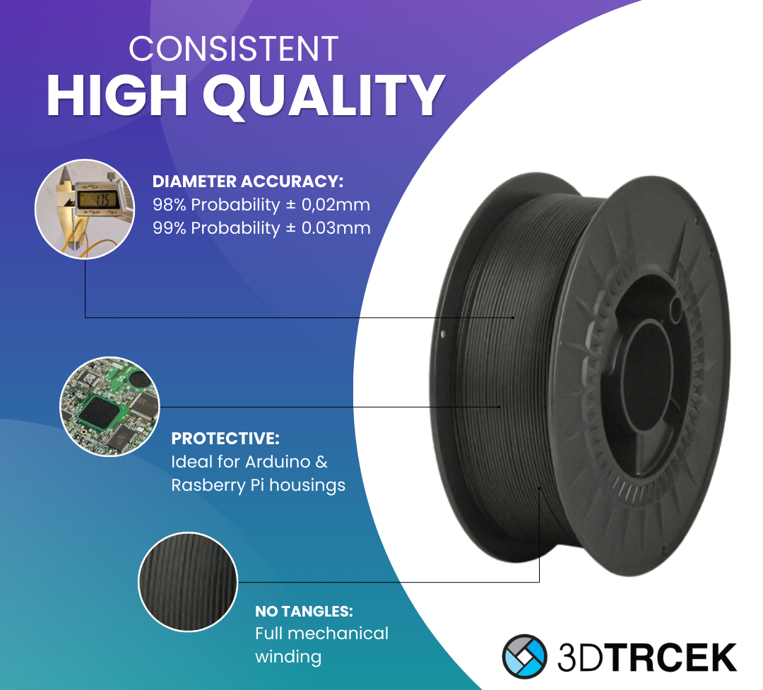 Leírás Kapcsolódó termékek Kérdése van? Vélemények 3DTrcek ESD HIPS filament – fekete színű A 3D TRCEK ESD HIPS filament elektrosztatikus disszipatív tulajdonságokkal rendelkezik. Ez azt jelenti, hogy biztonságosan és lassan szabadítja fel a felhalmozódott elektrosztatikus töltést, megakadályozva a hirtelen kisüléseket, amelyek károsíthatják az érzékeny elektronikát. Tökéletes Arduino és Raspberry Pi házakhoz. Az anyag elektromos tulajdonságai állandóak és nem függnek a légköri viszonyoktól. Használja áramköri lapok, mikrokontrollerek és egyéb elektronikus alkatrészek védelmére. Ideális érzékelőburkolatokhoz, vezérlőegységekhez és elektronikus házhoz. ![]() Minőségbiztosítás